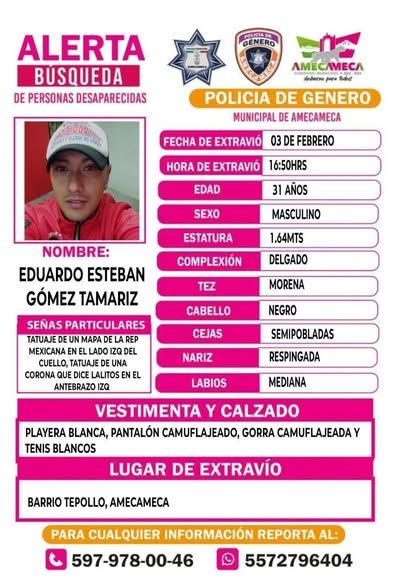 Si usted tiene datos que ayuden a la ubicación de Eduardo Esteban Tamariz, por favor repórtelos de inmediato a las autoridades correspondientes.
