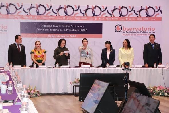 Toluca, Estado de México., 21 de febrero de 2026.– María Esther Rodríguez Hernández, Secretaria de las Mujeres, asistió a la Trigésima Cuarta Sesión Ordinaria y a la toma de protesta de la Presidencia 2026 del Observatorio de Participación Política de las Mujeres en el Estado de México (OPPMEM), realizada en Toluca.