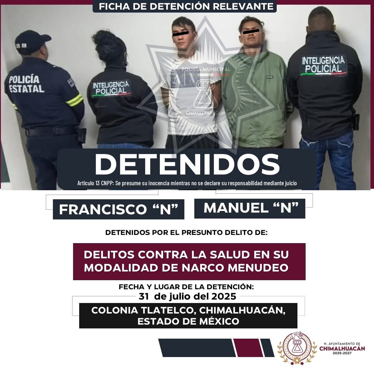 Ese mismo día, se llevó a cabo una segunda detención en la misma colonia, como resultado del trabajo conjunto entre personal de la Dirección General de Seguridad Ciudadana y Tránsito Municipal de Chimalhuacán, adscrito al área de Análisis e Inteligencia Policial, y la Unidad de Investigación e Inteligencia Policial (U.I.I.P.) de la Secretaría de Seguridad del Estado de México. Esta acción se realizó en el marco de los acuerdos establecidos en las Mesas de Pacificación por la Paz.
