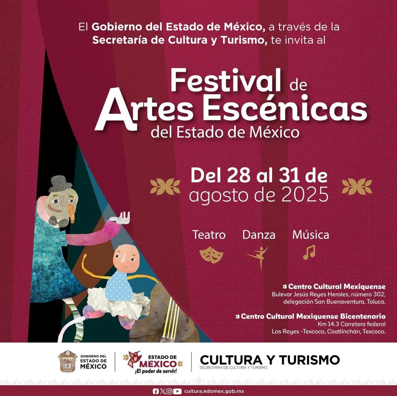 El Festival de Artes Escénicas reafirma el compromiso de la Secretaría de Cultura y Turismo del Estado de México de acercar expresiones artísticas de calidad a todas y todos. Los eventos son gratuitos y están pensados para que las infancias, juventudes y adultos disfruten en familia.
