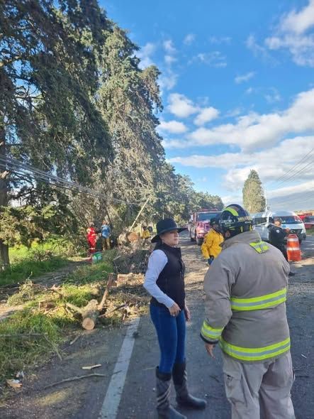 Amecameca, Estado de México., 10 de noviembre de 2025.- Por los fuertes vientos un árbol de cedro de aproximadamente 30 metros de altura cayó frente a una camioneta de transporte público, obstruyendo ambos carriles.