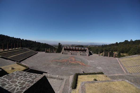 En el lado oriente se localiza la plaza principal denominada ’Sagitario’ o Centro de Ceremonias Danzas y Ritos ’La Glorieta del Centinela’, y al poniente del edificio ’La Plaza del Coloso’, con el sorprendente mural de ’Dámishy’ (jaguar que habla y camina) obra del escultor y pintor Luis Aragón.