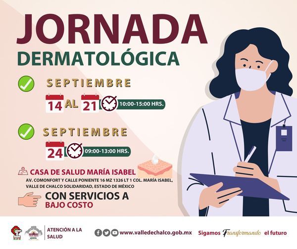Valle de Chalco, Estado de México.- 10 de septiembre de 2022.- Valle de Chalco, Estado de México.- 10 de septiembre de 2022.- El gobierno de local te invita a las jornadas de salud dermatológica a bajo costo en la Casa de Salud de la colonia María Isabel, ubicada en la avenida Ignacio Comonfort y Poniente 16, en apoyo a los padres de familia y a los adolescentes preocupados por la salud de su piel.