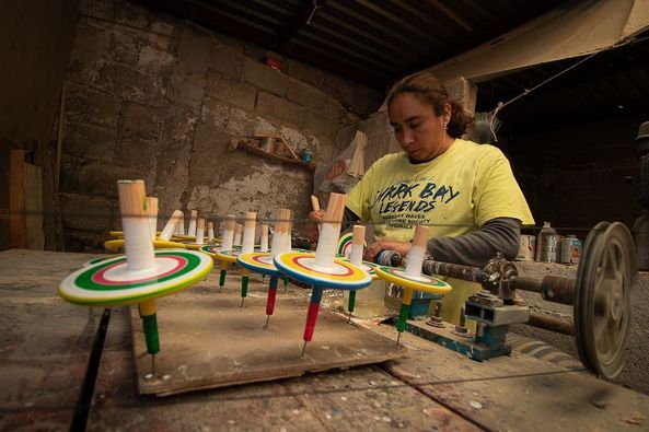 La materia prima que utilizan es la madera, solventes, pintura y la herramienta adecuada para dar forma a los juguetes como el torno y las sierras. Son varios los procesos y las horas que requieren para elaborar cada pieza.
