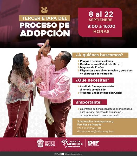 Del 8 al 22 de septiembre, el DIFEM emitirá 150 fichas como primer paso del trámite. Las personas interesadas deberán acudir personalmente con identificación oficial a la Subdirección de Adopciones y Familias de Acogida, en un horario de 9:00 a 16:00 horas.