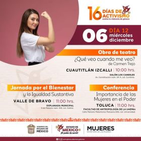 • Del 25 de noviembre al 10 de diciembre realizarán talleres, conferencias y obras de teatro, entre otras. Los interesados en participar pueden conocer más de estas actividades en http://semujeres.edomex.gob.mx/ y en las redes sociales Facebook y ’X’ @SeMujeresEdomex.