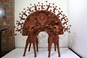 • Lleva por título ’La yunta’ y está elaborada por Tiburcio Soteno bajo la técnica de policromado. • Muestra a dos bueyes o mulas que trabajan unidos por un yugo.