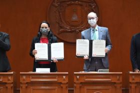 * Firman la Secretaria de Desarrollo Social, Alejandra Del Moral, y el rector de la Universidad Autónoma del Estado de México, Carlos Eduardo Barrera, Convenio General de Participación para fortalecer la política social estatal.