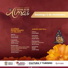 • El Festival de las Almas 2025 concluirá hoy con el concierto de Motel en el Jardín Central del Pueblo Mágico de Valle de Bravo. • La Secretaría de Cultura y Turismo invita a la premiación del tradicional desfile CatrinValle, en Jardín Central.