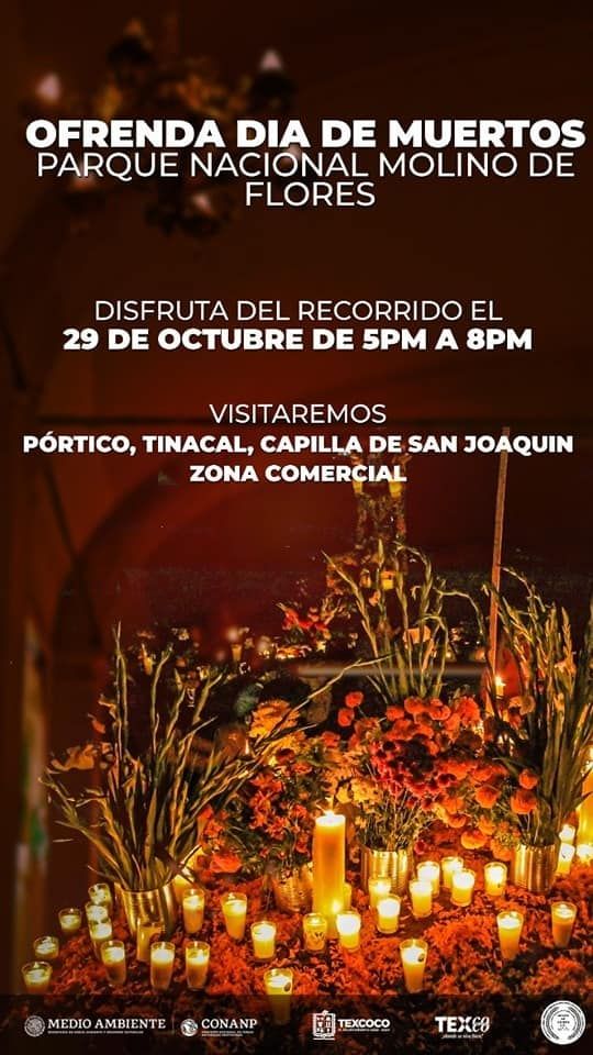 Como parte de estas tradiciones, la administración de la ex hacienda Molino de Flores a cargo del área de Ecología dependiente de la Dirección de Desarrollo Urbano, la Secretaría del Medio Ambiente, la Comisión Nacional de Áreas Naturales Protegidas y el gobierno de Texcoco realizaron la invitación al público en general para que acudan a las visitas guiadas en los vestigios de este espacios, en donde podrán apreciar las tradicionales ofrendas de la temporada.